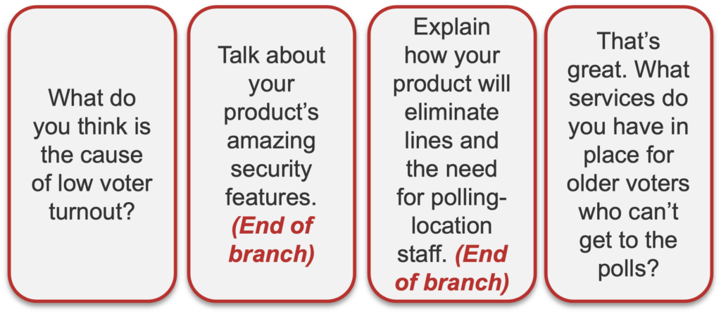 By preparing question trees, it’s like you’ve already read the whole book and know which way all of the choices will lead, so you can navigate to the end without ending up dead. Okay, that’s where the metaphor breaks down, but didn’t you always end up dying in those books? How about this? Question trees allow you enough foresight to navigate to the end of the meeting without your deal being dead.
