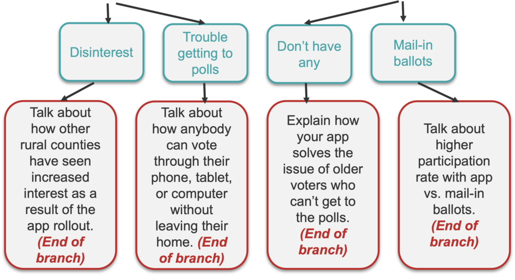 Developing a question tree is a type of brainstorming activity. Let’s say your company has developed a voting app that you hope will eventually allow citizens to vote for candidates in national, state, and local elections from the comfort of their own home.