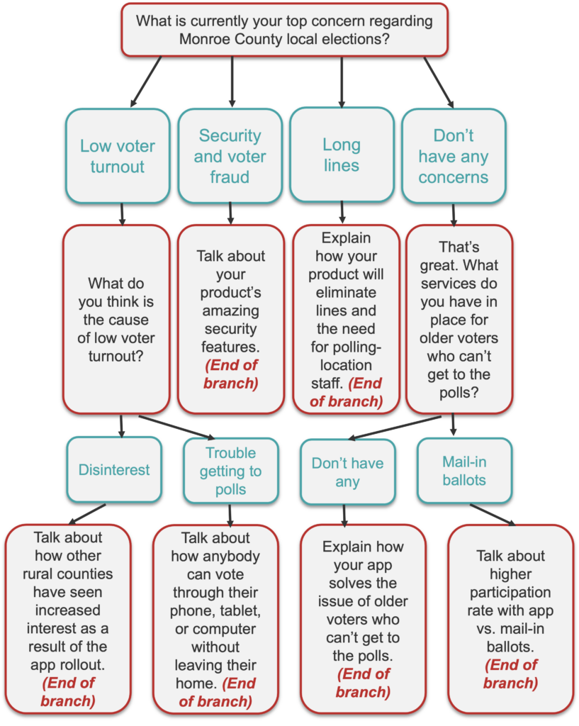 Currently, your prospects are small, rural counties with aging populations that have upcoming, off-year, local elections. Next week, you have a call with potentially-interested local officials in Monroe County, Wisconsin, and you want to be well-prepared. Your question-tree preparation would look something like this: